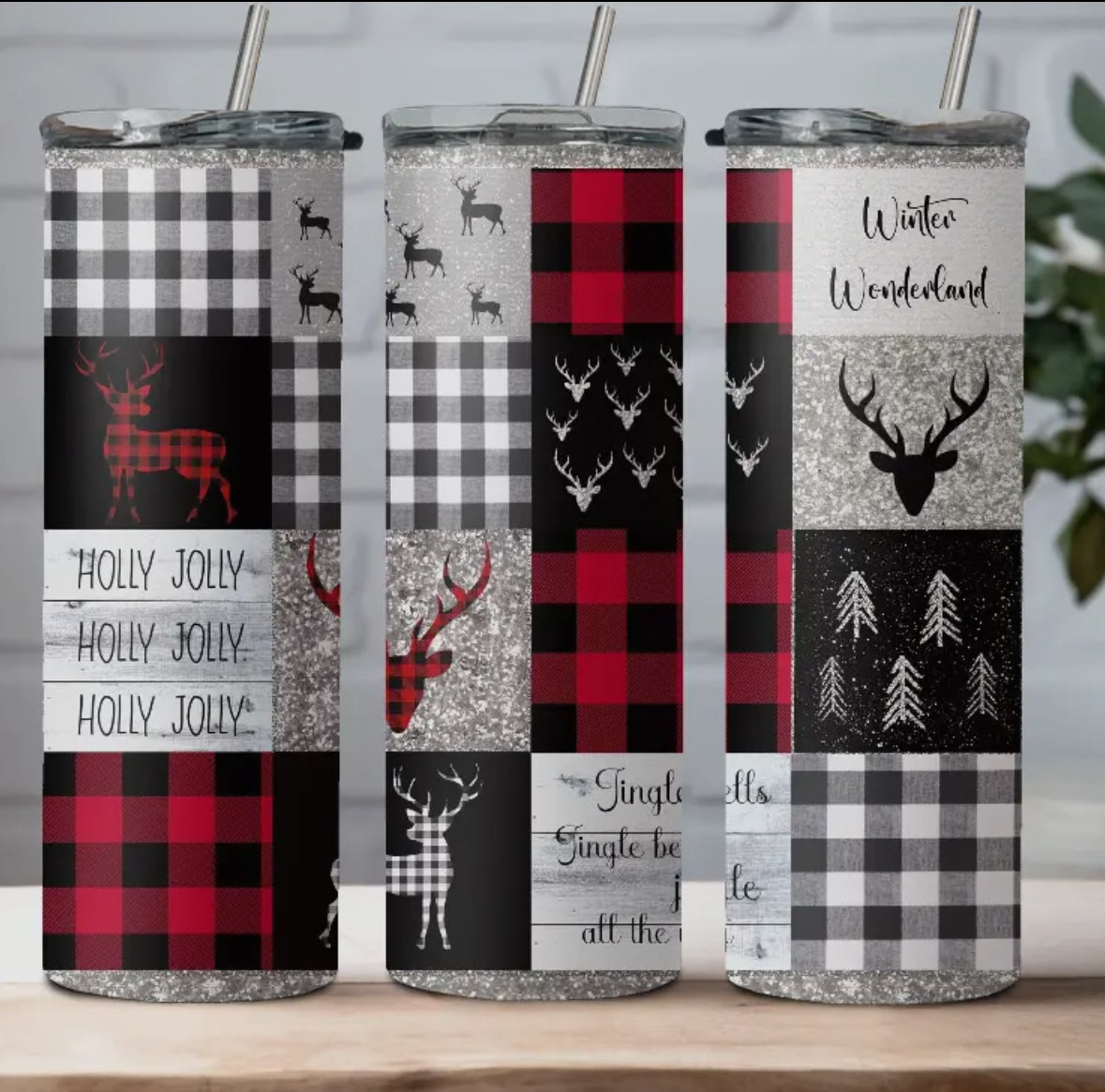 20 oz Stainless Steel Tumbler - Christmas - Plaid Reindeer